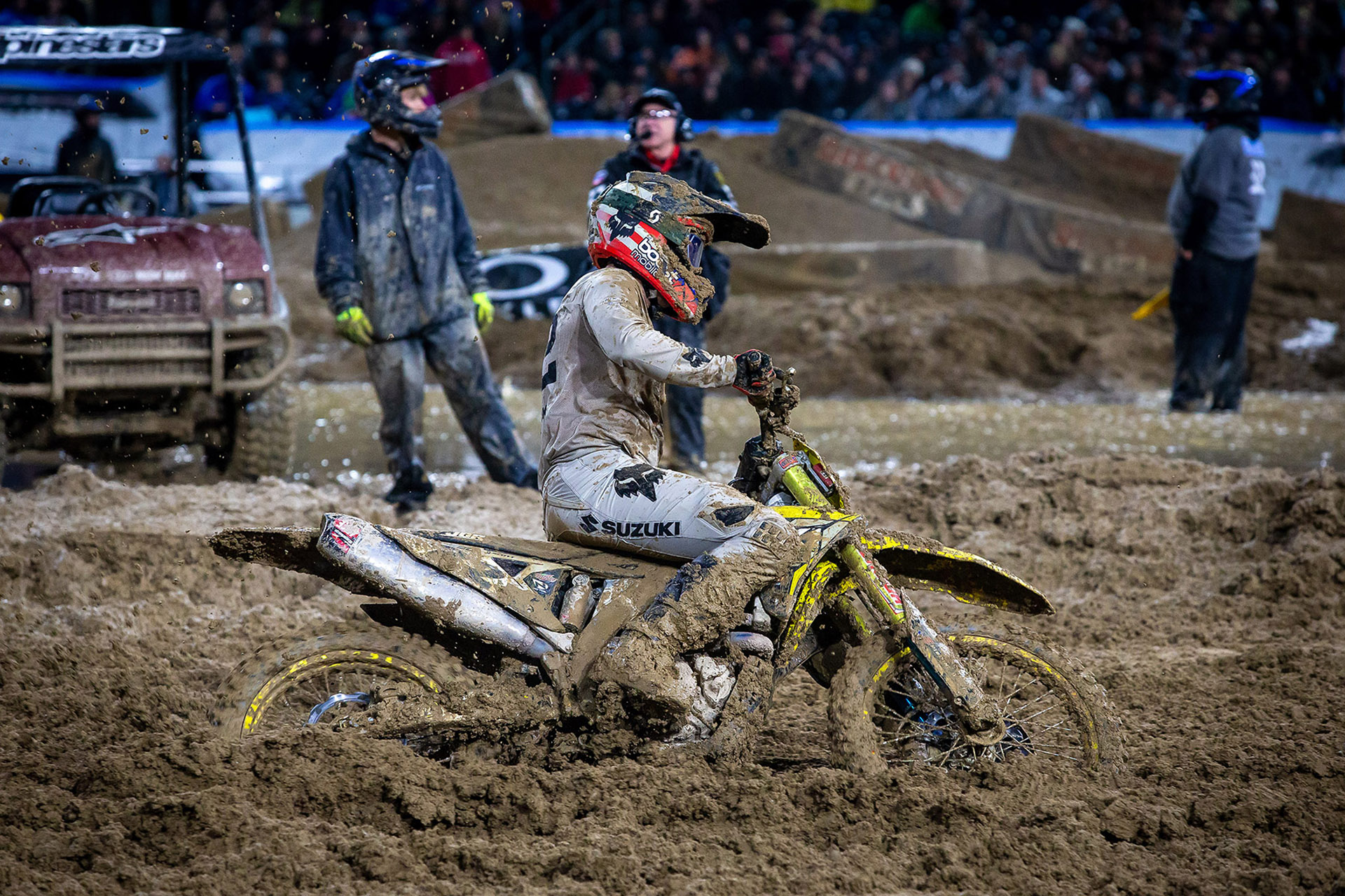 The JGRMX/Yoshimura/Suzuki Factory Racing Team ventured to PETCO Park in San Diego, California, for round five of the 2019 Monster Energy Supercross series. A challenging track caused by a winter rainstorm didn’t stop 39,840 faithful fans from watching Suzuki RM-Z250 rider Jimmy Decotis rocket up to a third-place finish in the main event. Teammate Enzo Lopes finished third in his heat race but unfortunately, was held back in the main. In the 450 ranks, Supercross Champion Chad Reed soldiered through the challenging conditions to finish a season-best fifth place on his Suzuki RM-Z450. Justin Hill sustained a crash in qualifying practice that sent him to the hospital for further evaluation.